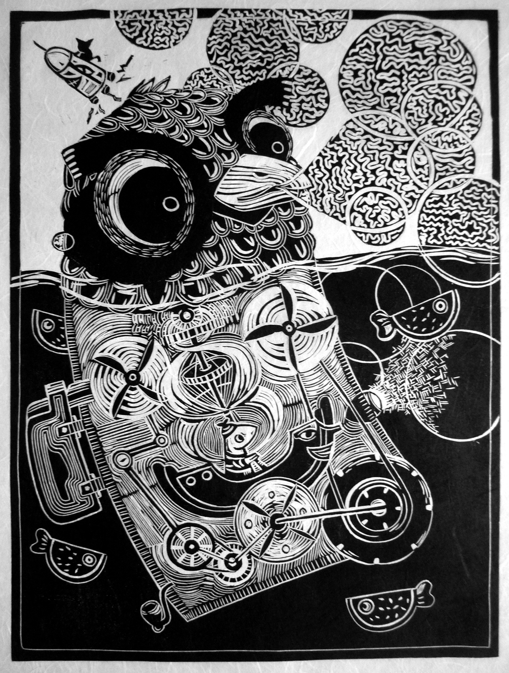 I have to play play play, always. Since I was a child, I have been drawing and painting and experimenting. I will never stop doing this, until I die. When I came to Merida I taught myself about printmaking and linocut/carving and now I teach this process every afternoon in my studio. This past summer I went back to Barcelona to be part of a printmaking show. I sold 90% of my art and used that to buy specialized carving tools to continue my work here in Merida. I am also working on a book. I would say my curiousity inspires what I do next.