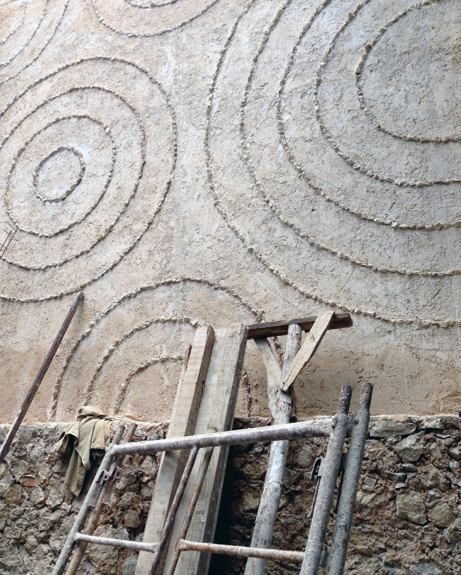 blue-wallSe tomaron alrededor de cinco meses y el trabajo de cinco personas para construir el muro de piedra labrado a mano. Ata me contaba esto mientras supervisábamos la estructura de 3.5 metros de alto. El muro se extiende alrededor de 10 metros a través de un espacio arbolado, y es lo suficientemente ancho como para que se pueda bailar entre esta estructura, realmente quería hacerlo, es un espacio muy hermoso. “tres hombres construyeron uno en tres días”, menciono él, apuntando a un muro aún más grande y alto hecho de blocks de concreto recubierto de color turquesa. “ambos están hechos a mano, pero solo en el de piedra se puede observar lo que es una verdadera obra de arte.” Desde donde yo los observaba, ambos lucían muy artísticos.