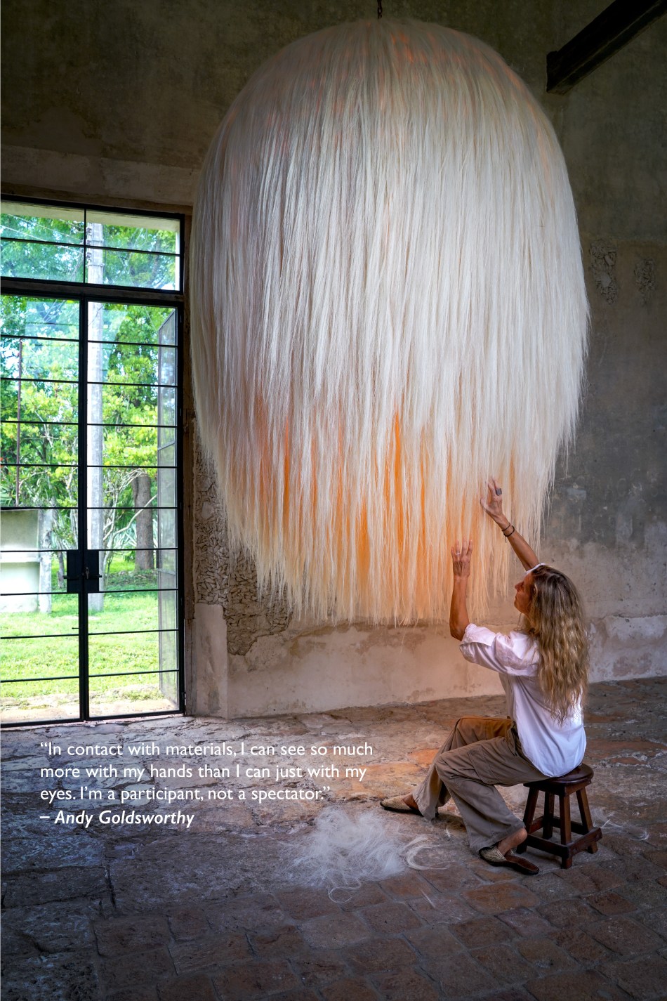 The studio of Angela Damman was once the machine room of a working hacienda, one of many left to ruin across the Yucatán. Today, a giant pendant hangs from the vaulted ceiling like an otherworldly cocoon. Woven from thousands of henequén fibres hand-spun to a gossamer sheen, the form seems to defy gravity. With surgical precision, Angela sculpts the fibres with a pair of barber’s shears — a process that will take two days to complete. In some ways, it is a world apart from her upbringing on a Minnesota family farm. In others, it feels like a return home.